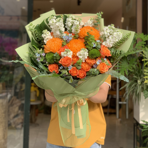 Bó hoa nổi bật với hoa hồng cam rực rỡ – biểu tượng của sự nhiệt huyết, niềm vui và năng lượng tích cực, kết hợp cùng hoa phi yến mềm mại tạo cảm giác nhẹ nhàng, bay bổng. Điểm xuyết thêm cúc mẫu đơn cam giúp tổng thể trở nên đầy đặn, hài hòa và sang trọng hơn. Các phụ liệu trang trí tinh tế được lựa chọn khéo léo, góp phần hoàn thiện một bó hoa vừa nổi bật vừa thanh lịch.