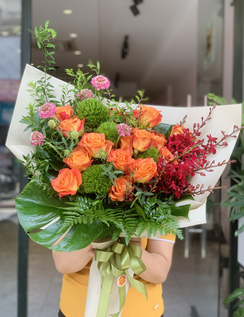 Bó hoa nổi bật với hoa hồng cam rực rỡ – biểu tượng của niềm vui, sự nhiệt huyết và năng lượng tích cực, kết hợp cùng lan bọ cạp cá tính tạo điểm nhấn độc đáo và nổi bật. Điểm xuyết thêm Scabiosa nhẹ nhàng, hoa ánh trăng mềm mại cùng lá trầu bà xanh mát và các phụ liệu trang trí tinh tế, giúp tổng thể bó hoa trở nên hài hòa, bay bổng và cuốn hút.