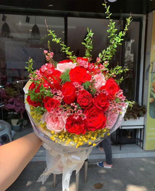 Bó hoa hồng nhỏ xinh được thiết kế nhẹ nhàng với sự kết hợp hài hòa giữa hoa hồng đỏ nồng nàn và hoa hồng cánh sen dịu dàng, điểm xuyết thêm thanh liễu mềm mại, hoa bi tinh tế cùng các phụ liệu cao cấp. Tổng thể bó hoa mang vẻ đẹp ngọt ngào,