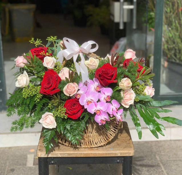 Giỏ hoa tươi được thiết kế hài hòa với sự kết hợp nổi bật của hoa hồng đỏ nồng nàn, hoa hồng kem dâu ngọt ngàotulip Nam Phi hiện đại. Các loại hoa được phối cùng phụ liệu cao cấp, tạo nên tổng thể mềm mại, tinh tế nhưng vẫn sang trọng và thu hút ánh nhìn.