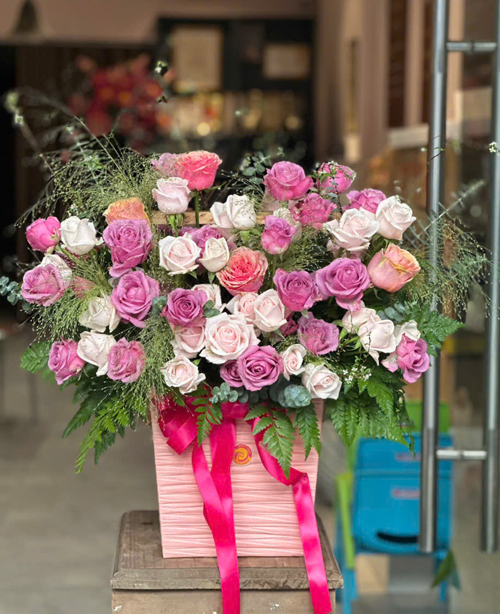Giỏ hoa tươi được thiết kế nhẹ nhàng và sang trọng với hoa hồng kem dâu ngọt ngào kết hợp cùng hoa hồng tím quyến rũ. Sự phối màu hài hòa giữa sắc kem dịu và tím sâu tạo nên tổng thể tinh tế, lãng mạn, phù hợp với nhiều phong cách không gian. Điểm xuyết thêm các phụ liệu cao cấp, giúp giỏ hoa thêm cân đối và nổi bật.