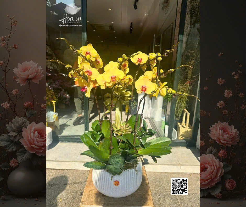 Màu sắc: Lan có màu vàng tươi rực rỡ, cánh hoa to và đều, với phần lưỡi (môi) màu đỏ hoặc hồng đậm tạo điểm nhấn nổi bật ở trung tâm. Màu vàng thường tượng trưng cho niềm vui, sự thịnh vượng, sung túc và tình bạn chân thành. Thiết kế: Chậu được cắm nhiều