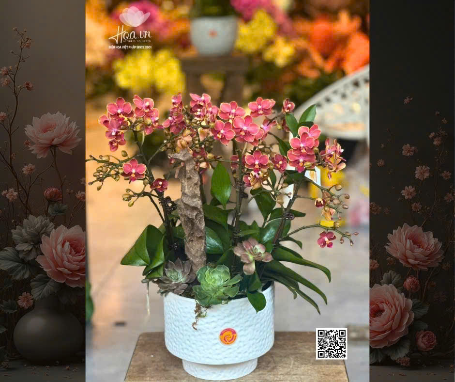 Lan có màu đỏ ớt (hồng đậm/đỏ hồng), là một sắc thái rực rỡ, ấm áp và tươi vui, thể hiện tình yêu và sự nhiệt huyết. Thiết kế: Chậu sử dụng một số cành lan mini, được sắp xếp vươn cao, tạo sự thanh thoát, duyên dáng. Phong cách decor tự nhiên (Zen/Wabi-Sabi): Chậu