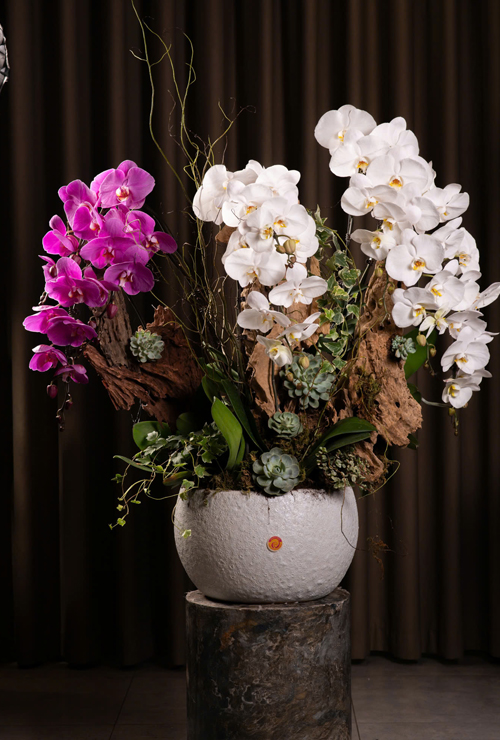 • 4 Ngồng Lan Hồ Điệp Trắng tinh khôi, kiêu sa được sắp đặt khéo léo, tựa như những dải mây trắng thuần khiết đang nhẹ nhàng lững lờ trôi, ôm ấp lấy đỉnh núi. Màu trắng của “mây” còn mang ý nghĩa về sự minh bạch, uy tín – nền tảng của mọi thành công lớn.